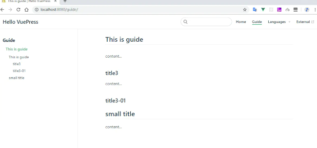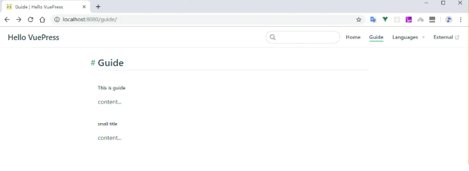 此时我们能够看到guide内容已成功显示,点击Lanuages能看到下拉,点击External会跳转到百度;