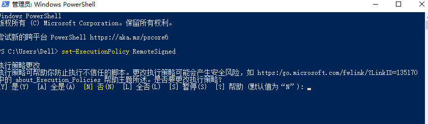 2、若要在本地计算机上运行您编写的未签名脚本和来自其他用户的签名脚本,请使用以下命令将计算机上的 执行策略更改为 RemoteSigned