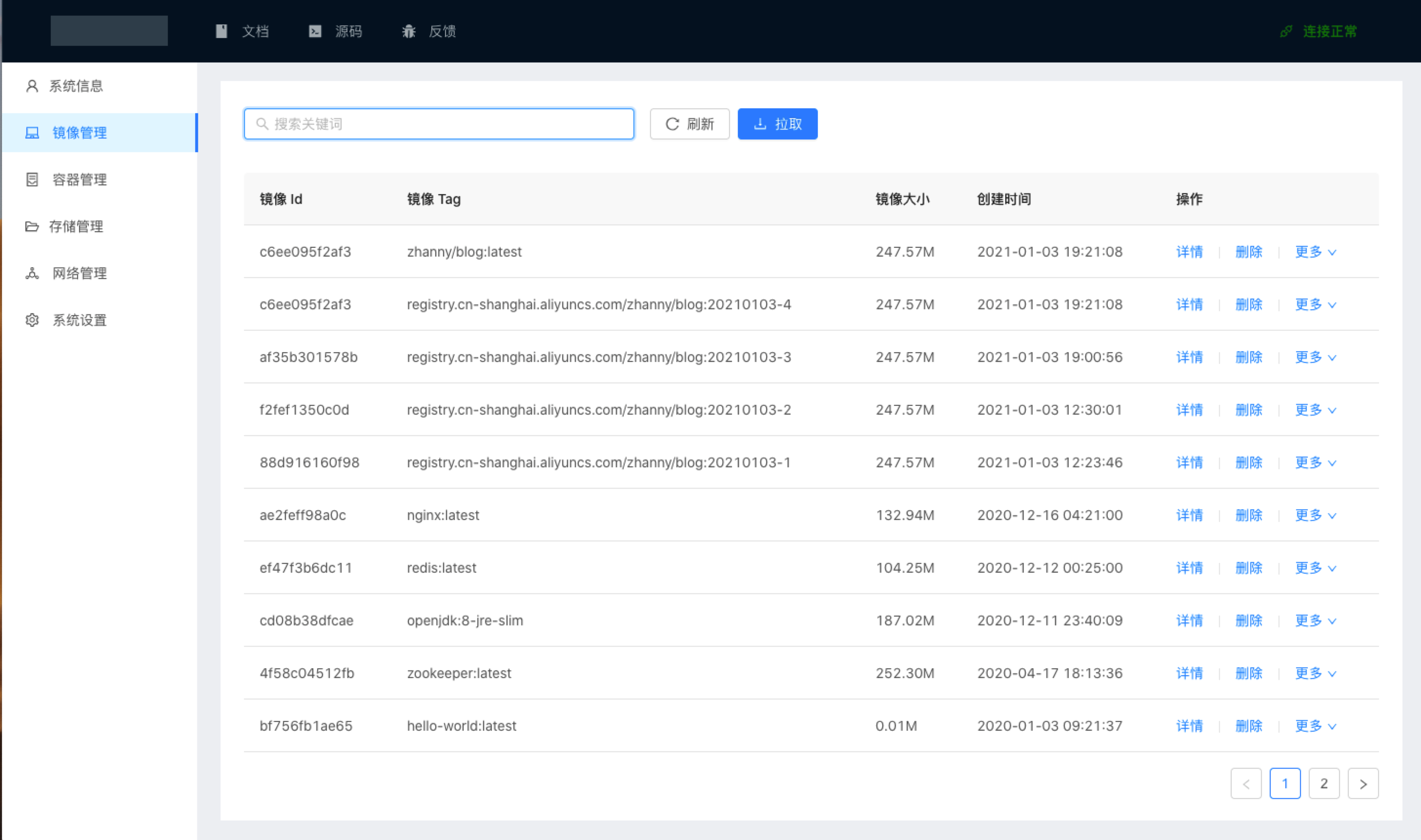详情、拉取、运行、导出、导入、删除、备份到本地 |