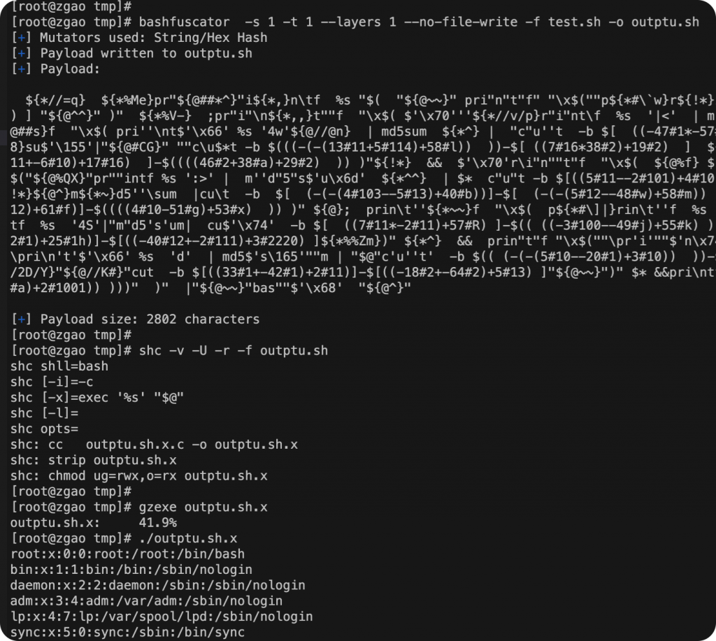 bashfuscator -s 1 -t 1 --layers 1 --no-file-write -f test.sh -o output.sh && shc shc -v -U -r -f output.sh && gzexe output.sh.x