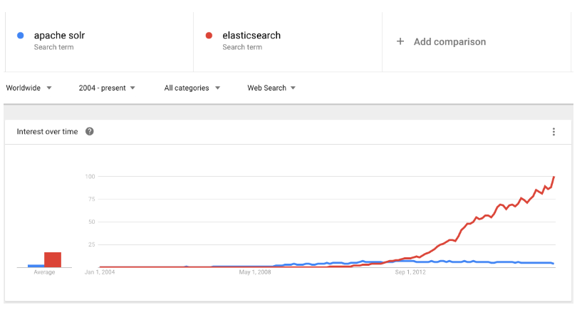 Solr 在搜索领域占据了多年的主导地位。然后,在2010年左右,Elasticsearch成为市场上的另一种选择。那时候,它远没有Solr那么稳定,没有Solr的功能深度,没有思想分享,品牌等等。
