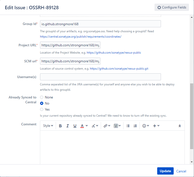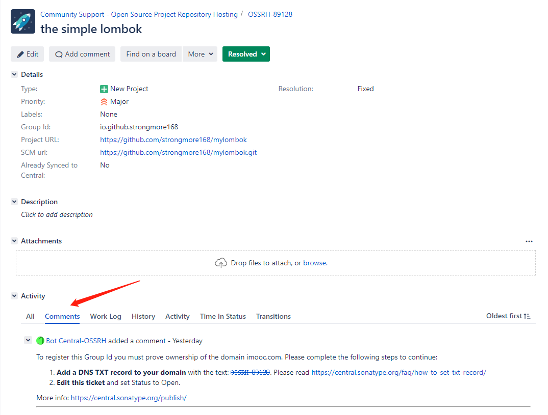 主要就是通过issue的评论来继续进行的,主要是验证groupId对应的域名是否是我们拥有的。我们使用第二种方式,使用github的域名,对应的groupId为