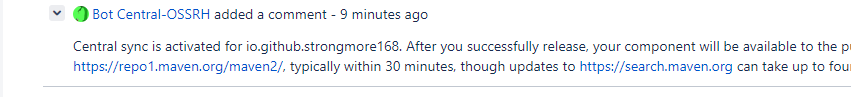 发布成功之后,邮件中(注册sonatype时填写的)会收到issue变化的信息,提示同步已经被激活,正常10分钟就可以更新同步。