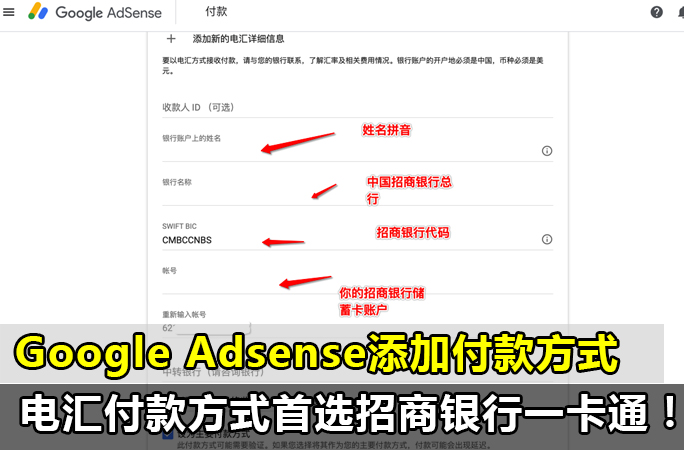补充:中国各大银行都支持跨境收款,但是每家银行政策不一样,例如中国银行不支持公对私,广发银行需要提供合同协议等,经过验证,目前招商银行收款非常稳定,暂时没有要求需要提供相关文件。添加付款方式后 Google AdSense 账户达到 $100,每月 21 日(中国时间 22 日)付款到指定银行账户。