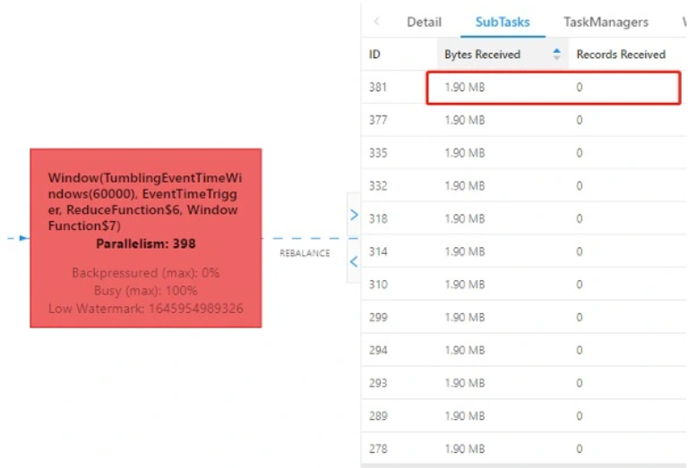 UI监控中能很清晰地印证上述分析,同一时刻的不同SubTask接收到的数据量差异极大: