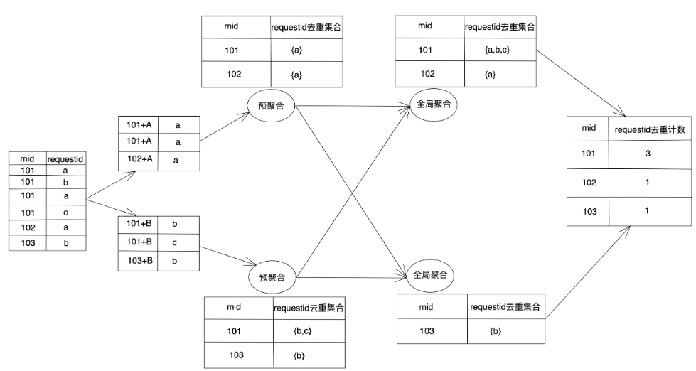 即按照媒体应用id(mid)及时间分钟维度分组聚合,对request_id及request_id+creative_id进行去重统计,还有对ad_count进行累加等指标。
