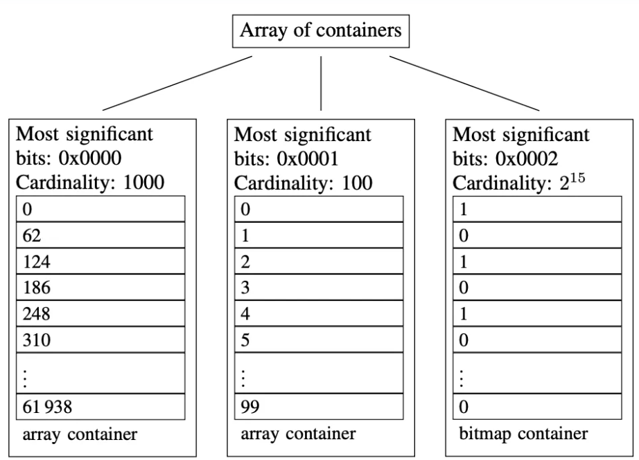 RoaringBitmap数据结构及原理》。3种container可以概括为: