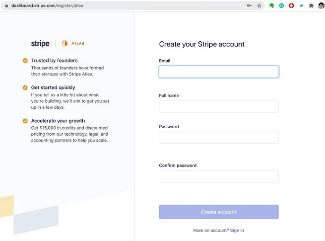 如果你还没一个Stripe账号,就在这里直接创建一个。如果你已经有了Stripe账号,就点击Sign in。