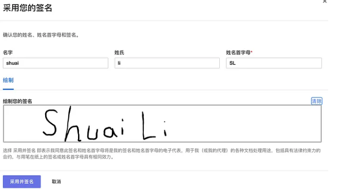 签字是直接使用电子签名的,具体来说就是用鼠标在浏览器中绘制出自己的名字: