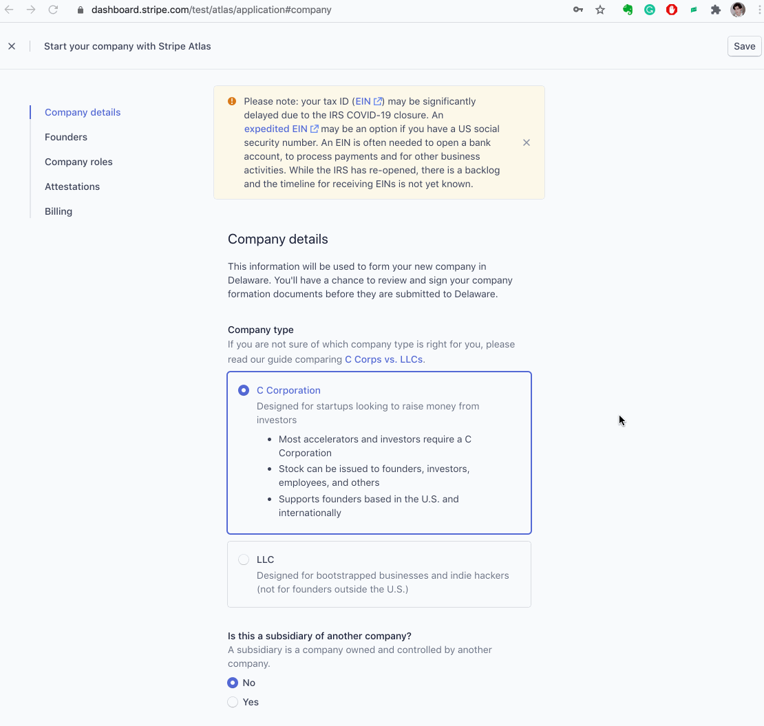 把上面两点加起来就是:对于中国居民而言,使用Stripe Atlas服务只能在特拉华州注册一个C Corporation。如果你有额外的需求,那么Stripe Atlas并不是一个很好的选择,下面的文章你也没必要看了。