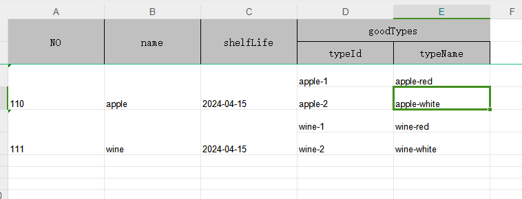 Goods(no=110, name=apple, shelfLife=Mon Apr 15 13:28:36 CST 2024, goodTypes=[GoodType(typeId=apple-1, typeName=apple-red), GoodType(typeId=apple-2, typeName=apple-white)])