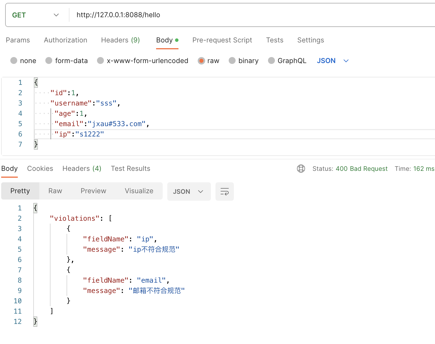 当校验失败时,我们通常希望向客户端返回一条有意义的错误消息。 为了使客户端能够显示有用的错误消息,我们应该返回一个统一的数据结构,其中包含每个校验失败的错误消息。