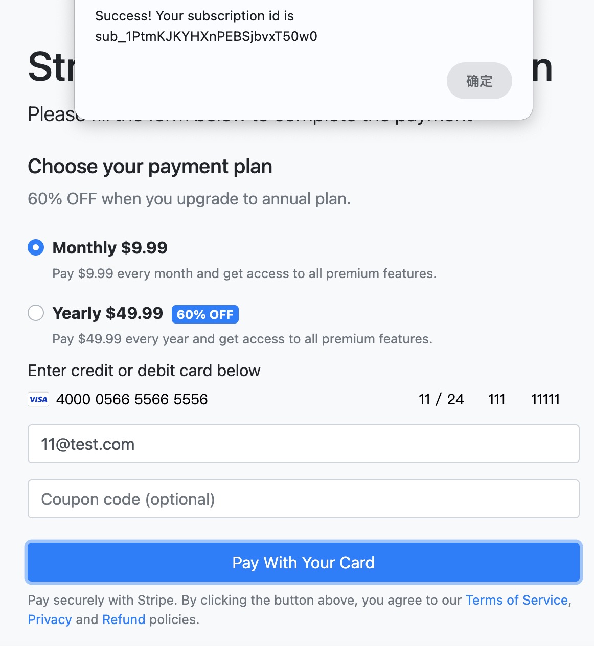 输入测试卡号,显示订阅成功(注意:是订阅产品上创建多个价格,而不是创建多个产品)