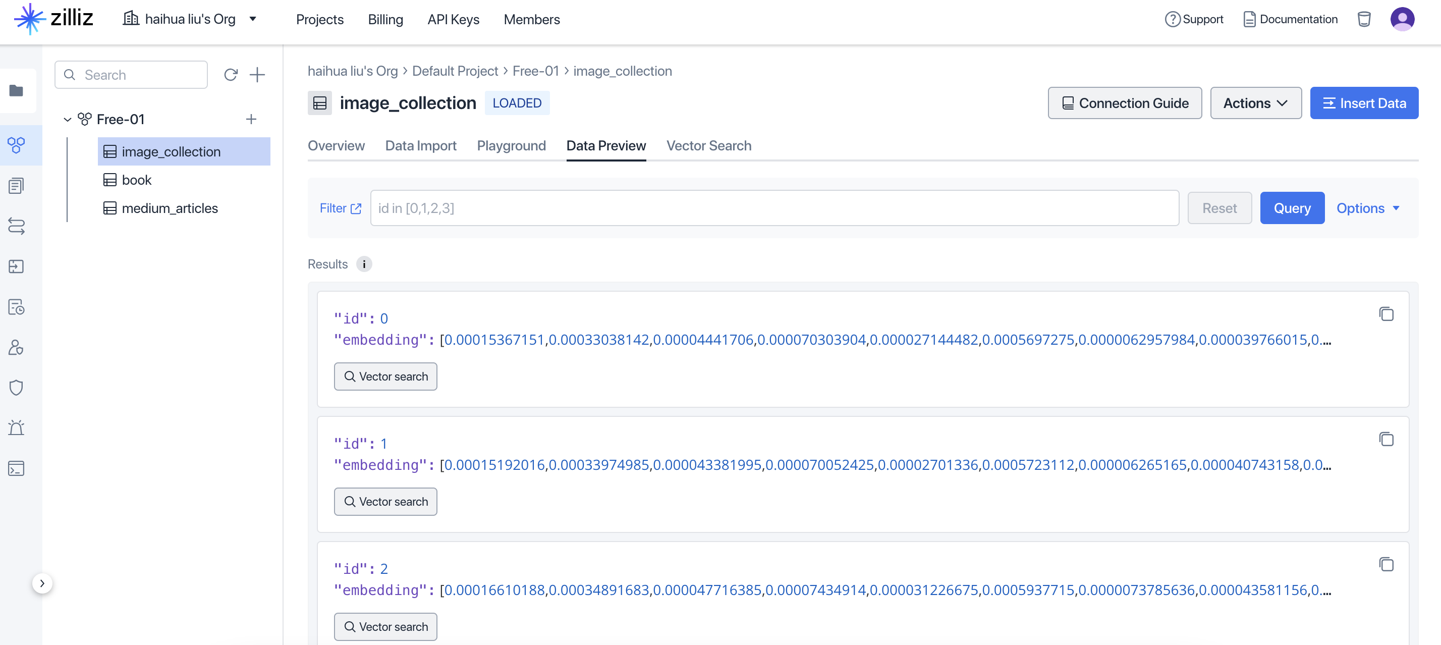 image_collection 集合中 embedding 字段的索引,以加快后续的相似性搜索。