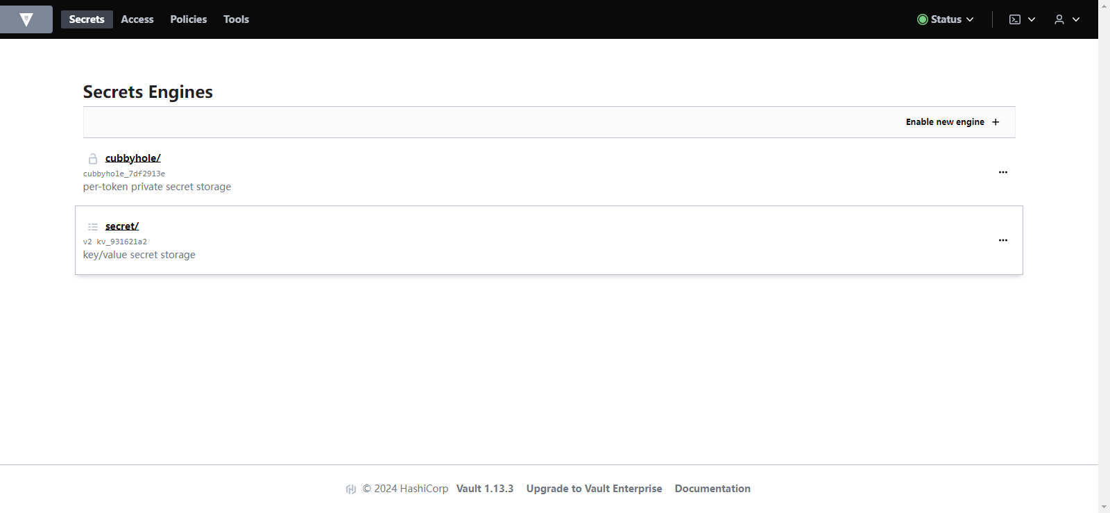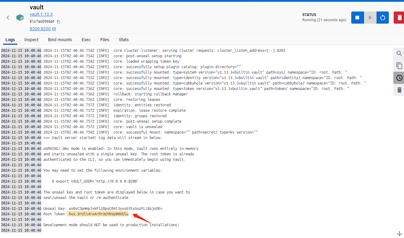 docker run --cap-add=IPC_LOCK -e 'VAULT_DEV_ROOT_TOKEN_ID=root' -e 'VAULT_DEV_LISTEN_ADDRESS=0.0.0.0:8200' -p 8200:8200 --name=vault -d vault:1.13.3