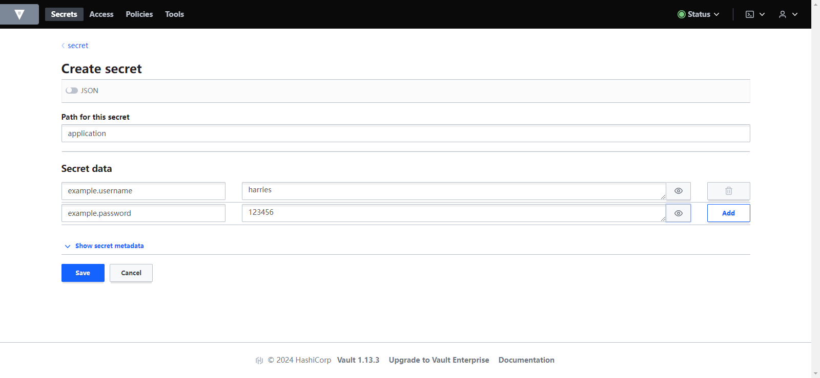vault kv put secret/application example.username=myuser example.password=mypassword