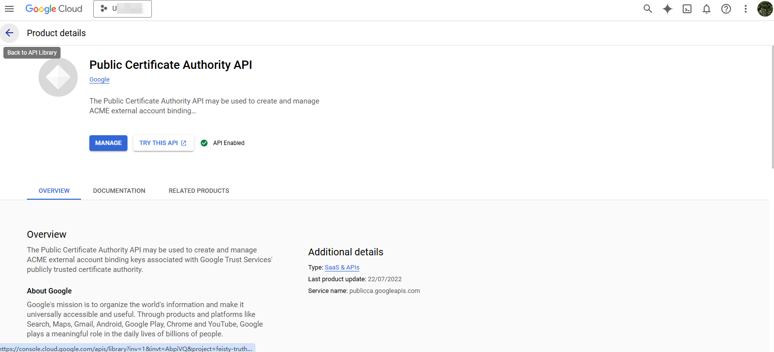 - 登录你的 GCP 控制台面板,进入 Public Certificate Authority API 管理页面(https://console.cloud.google.com/apis/library/publicca.googleapis.com)点击