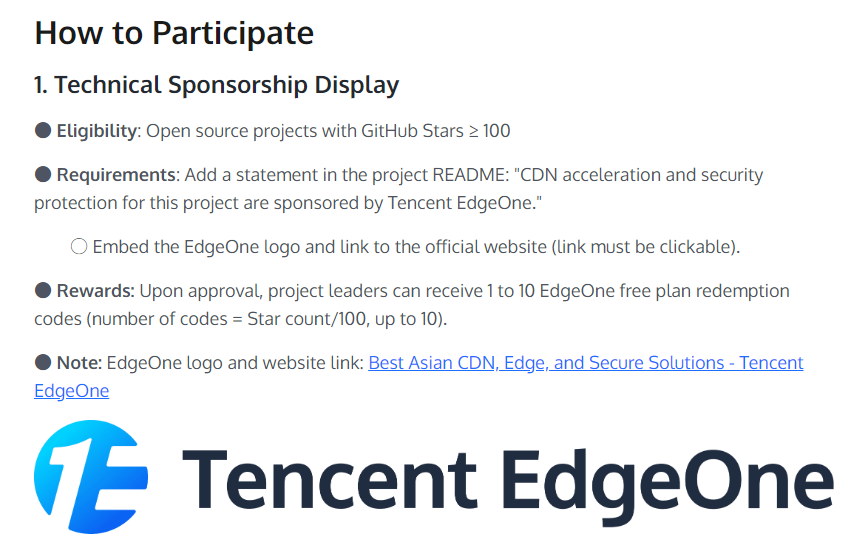 - 在项目 README 中添加声明:“本项目 CDN 加速及安全防护由 Tencent EdgeOne 赞助”