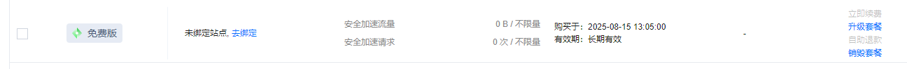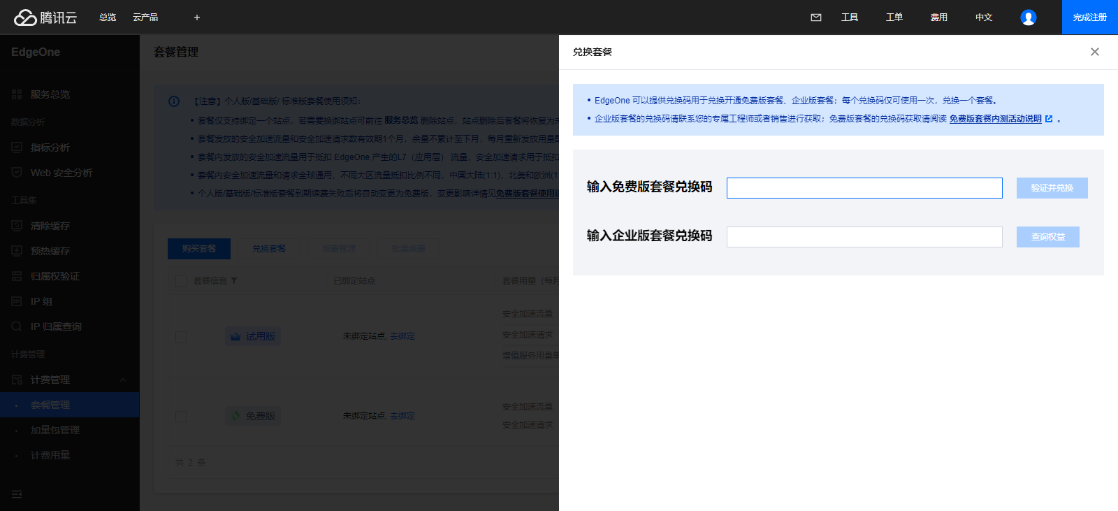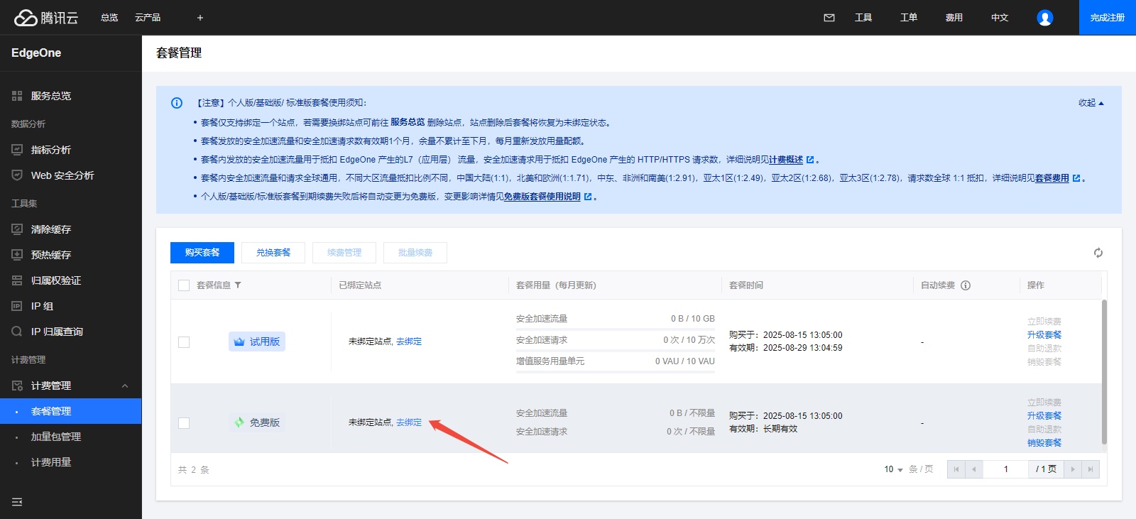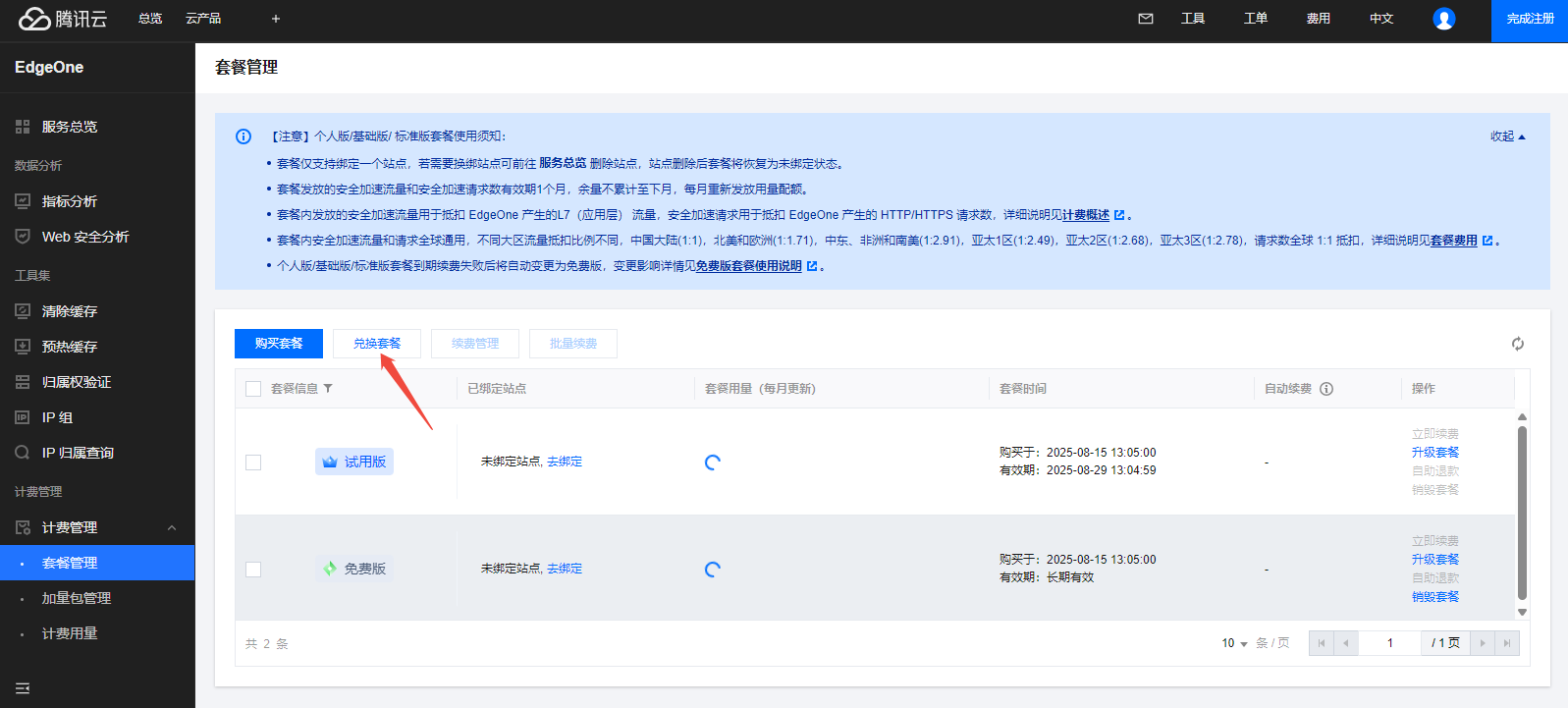 - 兑换成功后,控制台的资源列表中会显示EdgeOne 免费套餐