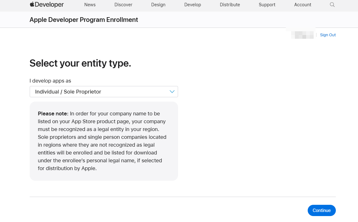 - 登录你的 Apple ID,选择 Individual(个人) 类型。