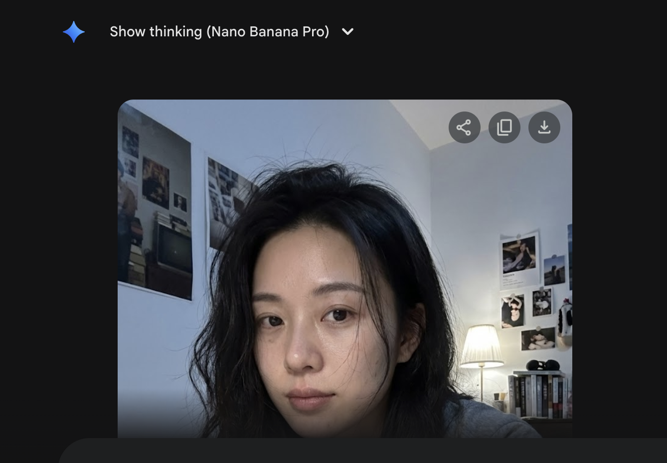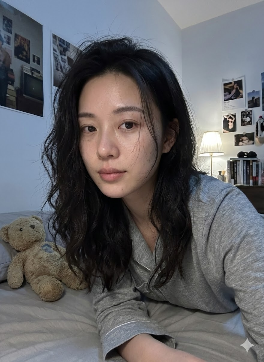 年轻中国女性,25-30岁,人物形象必须强烈、严格参考提供的参考图,脸型、五官比例、眉眼结构、鼻子与嘴唇形态高度一致,不要生成长面孔,不要偏倚参考图人物,不要网红脸,自然好看,五官真实,并非完美,有生活感,有记忆点,人物呈现高度写实状态,允许存在细微真实瑕疵,例如:轻微黑眼圈,轻微肤色不均或细小毛孔,不是“完美状态”,整体感觉真实,像真实存在的人,而不是生成感强的模特,长发自然披散,不对称,不是精心整理,有几缕头发自然垂落在脸颊或锁骨位置,呈现深夜居家真实状态,自然、随意,有女性魅力,表情放松,不刻意管理表情,有情绪,眼神自然,不一直直视镜头,偶尔游离,像真实聊天中的状态,妆容极淡,几乎素颜,无明显修饰,皮肤真实,有毛孔,不磨皮,不紧致,不油腻,穿着贴身居家睡衣或上衣,剪裁自然,材质柔软,贴合身体线条,不显瘦,性感来自真实与距离,而非造型,人物坐在床上,床头明确在画面右侧,床尾在画面左侧,床横向贯穿画面,人物坐在床靠近中部偏右位置,身体正对镜头,上半身明显前倾,人物与镜头距离非常近,脸部在画面中占比偏大,增强真实交流与亲密互动感,镜头位于人物正前方,与人物眼睛同一高度,正面构图(frontal shot),非自拍,画面中不出现相机或手机,背景为女生卧室,床铺自然整洁,床上有一个“毛绒玩偶”,有强陪伴感,不是装饰品,像生活物件,墙面为女生卧室,可见真实挂画,装饰不完全对称,整体真实,不是样板间,整体色调偏冷或中性,真实色彩,不做风格化调色,不暖黄,不暖味滤镜,不过度科技感,偏真实夜晚光线,夜晚环境,主光源为白色或中性灯光,光线略不均匀,允许轻微阴影,符合真实卧室照明,不追求完美补光,胸部以上或偏近景构图,脸部细节清晰,背景轻微虚化,画面有真实呼吸感,写实摄影风格,偏纪录感,偏生活影像,允许不完美,非商业广告,非摆拍,非棚拍。