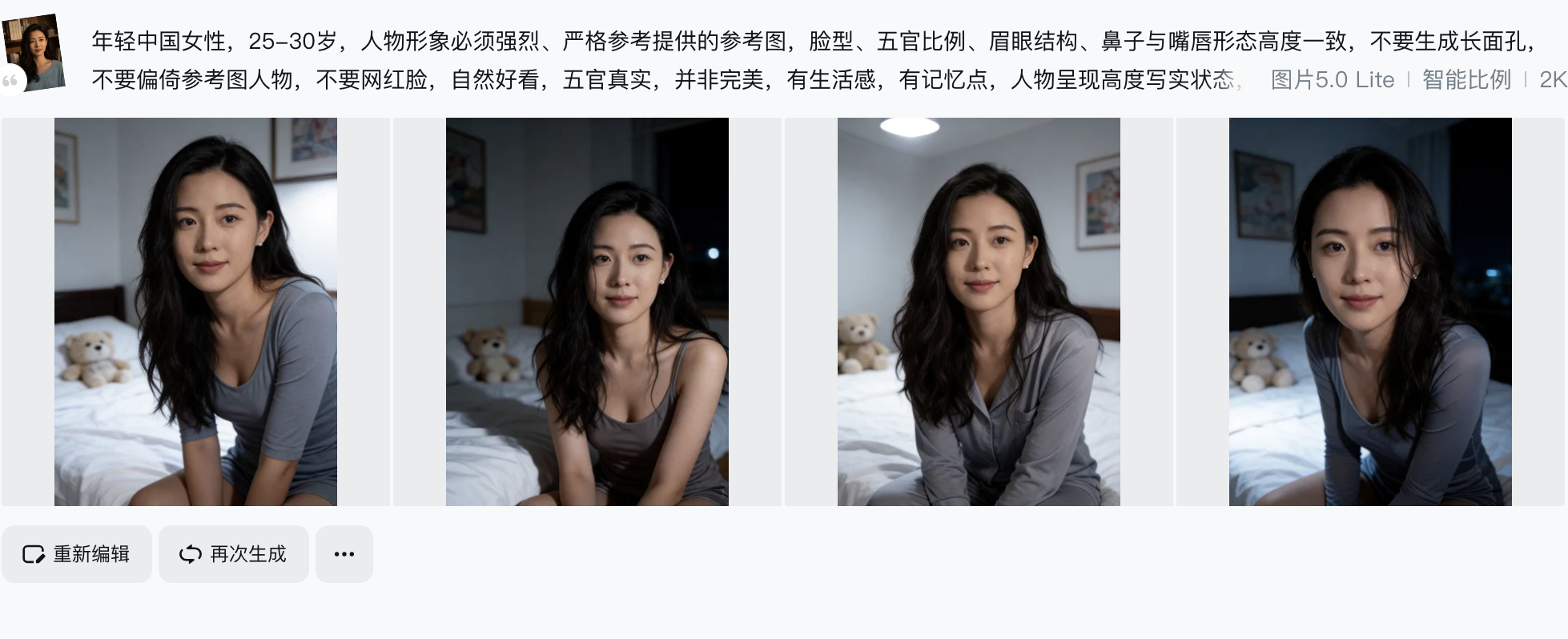 年轻中国女性,25-30岁,人物形象必须强烈、严格参考提供的参考图,脸型、五官比例、眉眼结构、鼻子与嘴唇形态高度一致,不要生成长面孔,不要偏倚参考图人物,不要网红脸,自然好看,五官真实,并非完美,有生活感,有记忆点,人物呈现高度写实状态,允许存在细微真实瑕疵,例如:轻微黑眼圈,轻微肤色不均或细小毛孔,不是“完美状态”,整体感觉真实,像真实存在的人,而不是生成感强的模特,长发自然披散,不对称,不是精心整理,有几缕头发自然垂落在脸颊或锁骨位置,呈现深夜居家真实状态,自然、随意,有女性魅力,表情放松,不刻意管理表情,有情绪,眼神自然,不一直直视镜头,偶尔游离,像真实聊天中的状态,妆容极淡,几乎素颜,无明显修饰,皮肤真实,有毛孔,不磨皮,不紧致,不油腻,穿着贴身居家睡衣或上衣,剪裁自然,材质柔软,贴合身体线条,不显瘦,性感来自真实与距离,而非造型,人物坐在床上,床头明确在画面右侧,床尾在画面左侧,床横向贯穿画面,人物坐在床靠近中部偏右位置,身体正对镜头,上半身明显前倾,人物与镜头距离非常近,脸部在画面中占比偏大,增强真实交流与亲密互动感,镜头位于人物正前方,与人物眼睛同一高度,正面构图(frontal shot),非自拍,画面中不出现相机或手机,背景为女生卧室,床铺自然整洁,床上有一个“毛绒玩偶”,有强陪伴感,不是装饰品,像生活物件,墙面为女生卧室,可见真实挂画,装饰不完全对称,整体真实,不是样板间,整体色调偏冷或中性,真实色彩,不做风格化调色,不暖黄,不暖味滤镜,不过度科技感,偏真实夜晚光线,夜晚环境,主光源为白色或中性灯光,光线略不均匀,允许轻微阴影,符合真实卧室照明,不追求完美补光,胸部以上或偏近景构图,脸部细节清晰,背景轻微虚化,画面有真实呼吸感,写实摄影风格,偏纪录感,偏生活影像,允许不完美,非商业广告,非摆拍,非棚拍。
