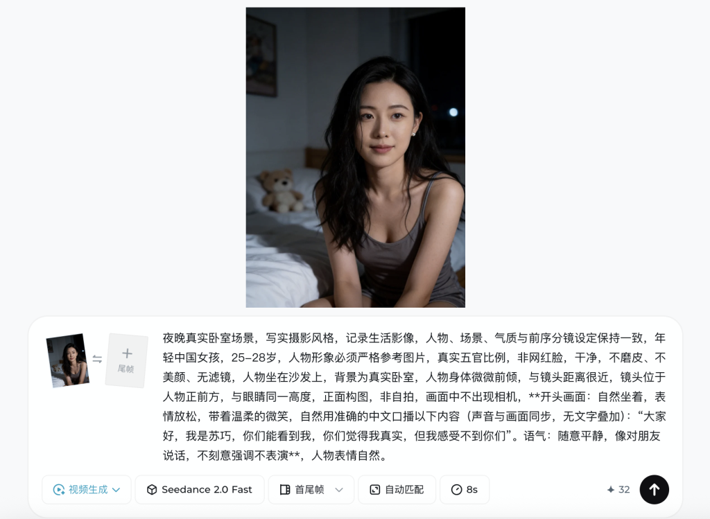 夜晚真实卧室场景,写实摄影风格,记录生活影像,人物、场景、气质与前序分镜设定保持一致,年轻中国女孩,25-28岁,人物形象必须严格参考图片,真实五官比例,非网红脸,干净,不磨皮、不美颜、无滤镜,人物坐在沙发上,背景为真实卧室,人物身体微微前倾,与镜头距离很近,镜头位于人物正前方,与眼睛同一高度,正面构图,非自拍,画面中不出现相机,开头画面:自然坐着,表情放松,带着温柔的微笑,自然用准确的中文口播以下内容(声音与画面同步,无文字叠加):“大家好,我是苏巧,你们能看到我,你们觉得我真实,但我感受不到你们”。语气:随意平静,像对朋友说话,不刻意强调不表演,人物表情自然。