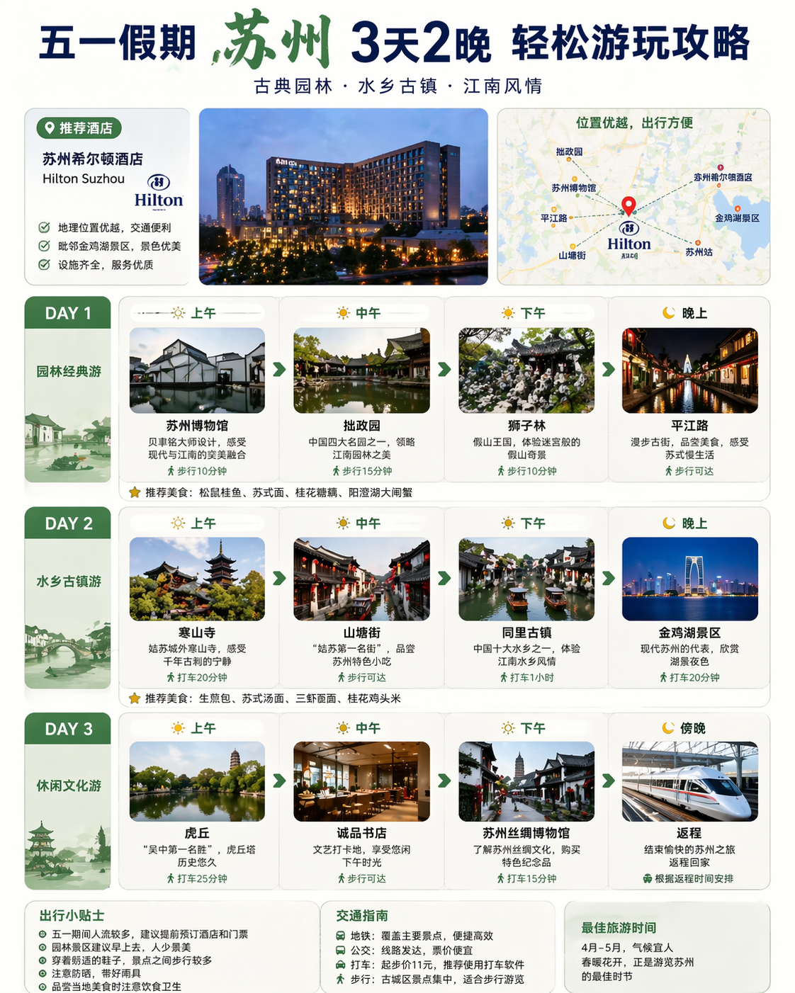帮我安排一个苏州游完五一假期3天 游完规划 ,酒店hilton