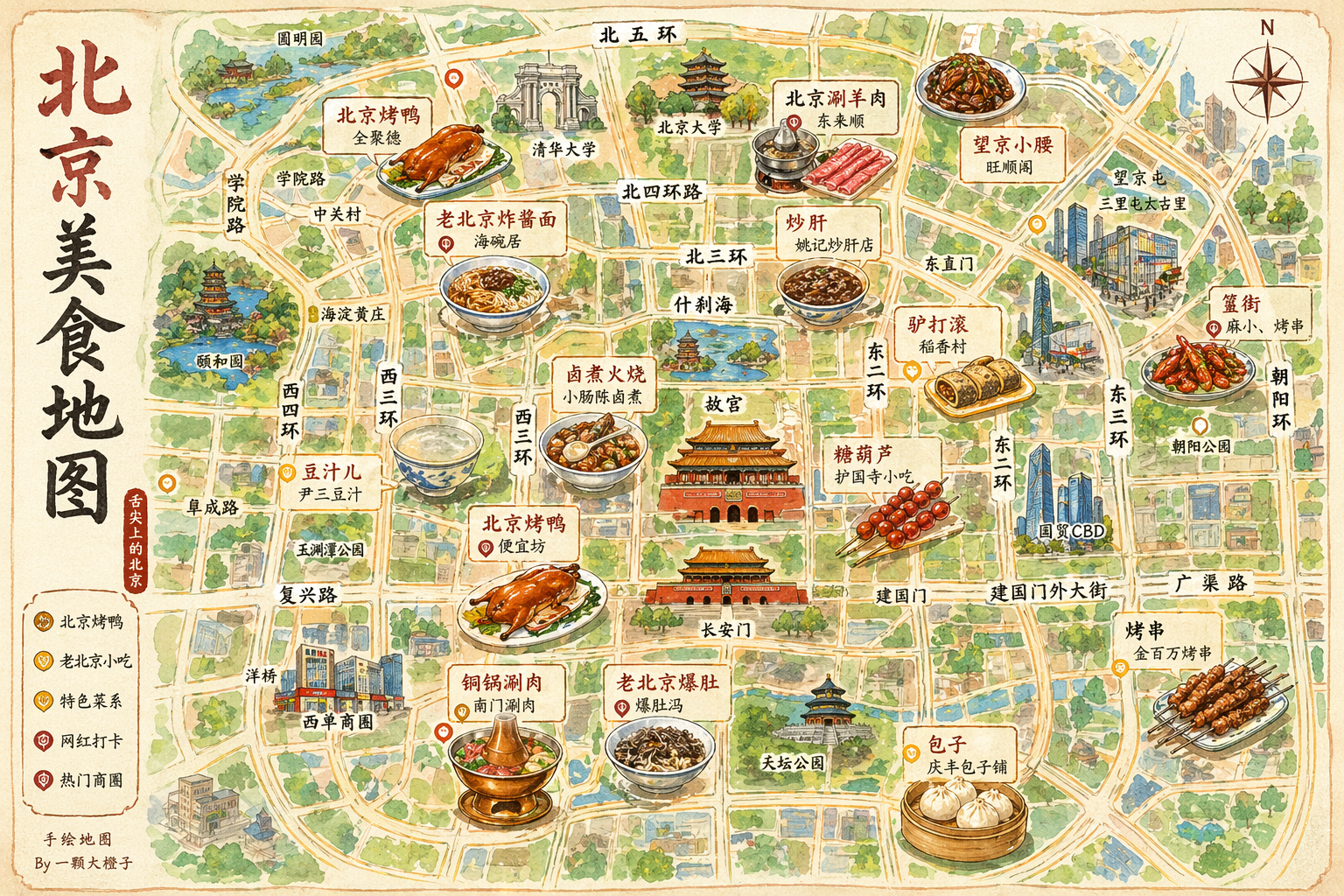 一张手绘的北京美食地图,鸟瞰的视角,标注主要道路