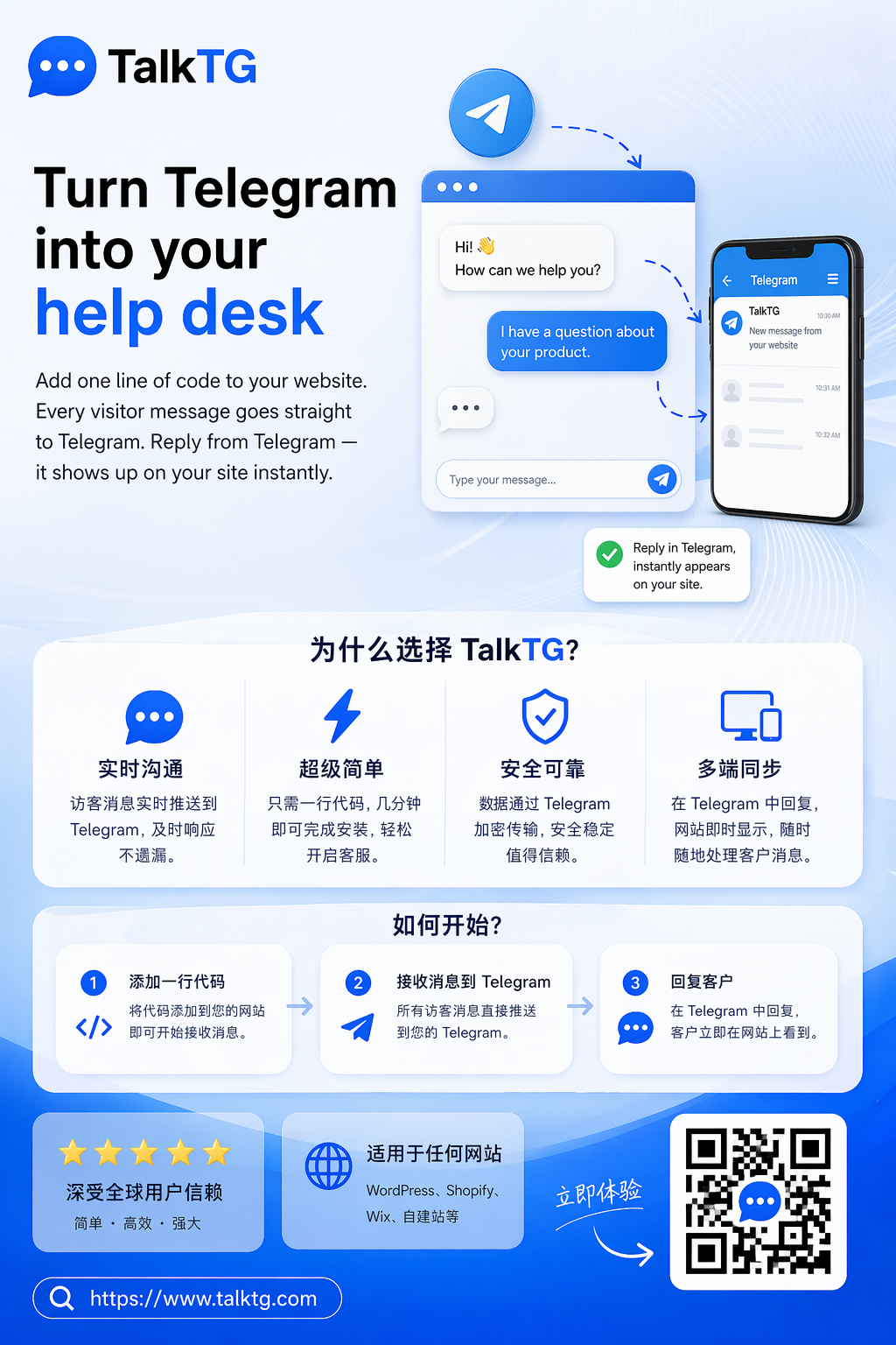 这是一个在线客户网站Turn Telegram into your help desk Add one line of code to your website. Every visitor message goes straight to Telegram. Reply from Telegram — it shows up on your site instantly. 图片上介绍一下该网站特点,网址生成二维码在右下角