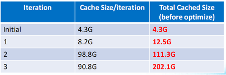 如图1所示,这张表格是真实应用的例子,第一列是它的迭代轮数,第二列是需要缓存的RDD,第三列是累计被缓存的RDD。大家知道很多大规模计算往往都是千轮迭代,但只到第三轮迭代就需要这么大的内存空间了。那么,是不是表示Spark应用就需要这么大的内存空间呢?事实显然不是这样。