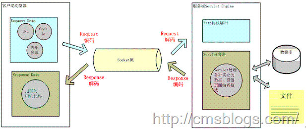 用户想服务器发送一个HTTP请求,需要编码的地方有url、cookie、parameter,经过编码后服务器接受HTTP请求,解析HTTP请求,然后对url、cookie、parameter进行解码。在服务器进行业务逻辑处理过程中可能需要读取数据库、本地文件或者网络中的其他文件等等,这些过程都需要进行编码解码。当处理完成后,服务器将数据进行编码后发送给客户端,浏览器经过解码后显示给用户。在这个整个过程中涉及的编码解码的地方较多,其中最容易出现乱码的位置就在于服务器与客户端进行交互的过程。
