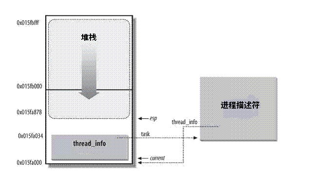 内核栈的栈底存放这thread_info, 通过获取内核栈,以得到thread_info的信息,thread_info里面有一个指向task_struct (进程描述符, 里面放着进程的各种信息)的指针, 通过这个指针, 就可以获取进程的各种信息了。