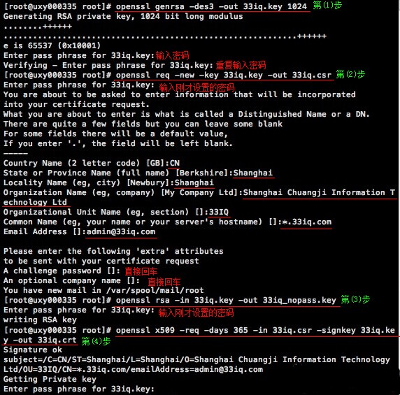 为晒晒IQ网颁发证书。ssh登陆到服务器上,终端输入以下命令,使用openssl生成RSA密钥及证书。