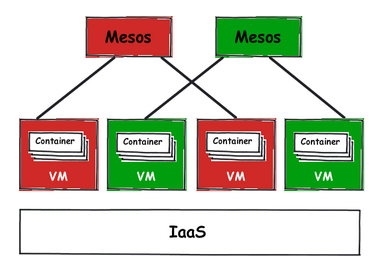 这个架构的好处是简单易行,不好的地方在于GuestOS的不透明性。前文提过,CaaS的理念是分离底层IaaS资源,使得用户专注于应用开发。GuestOS存在破坏了这种透明性,比如必须预建VM集群。换句话说,用户需要在应用部署前做好各种规划:集群规模,VM size,GuestOS选择(CentOS,Ubuntu?),GuestOS内部的配置(磁盘RAID,LVM)等等。大家都知道,现实里计划总是赶不上变化,每次新业务需求出现时往往关联着底层配置的变化。于是,虽然有了CaaS,但运维的同学们仍然需要频繁的手动调整VM配置,管理GuestOS。